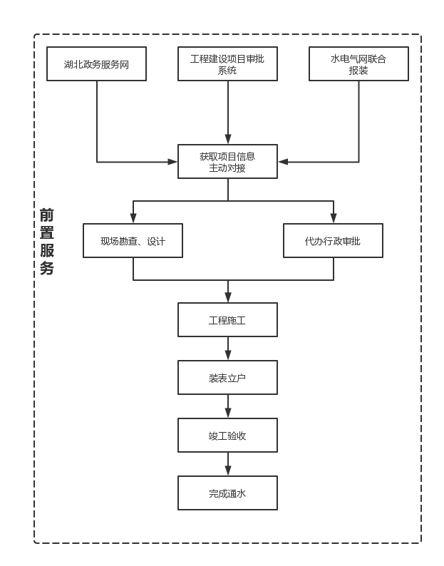 (一)通過政企數(shù)據(jù)共享及通過湖北省工程建設(shè)審批系統(tǒng)、湖北政務(wù)服務(wù)網(wǎng)等渠道,獲取用戶信息,主動對接,主動掌握用戶用水需求,根據(jù)接入地點的不同和用戶需求,確定是否需要在地塊紅線外增設(shè)接入管線,并將后續(xù)相關(guān)事項告知用戶。